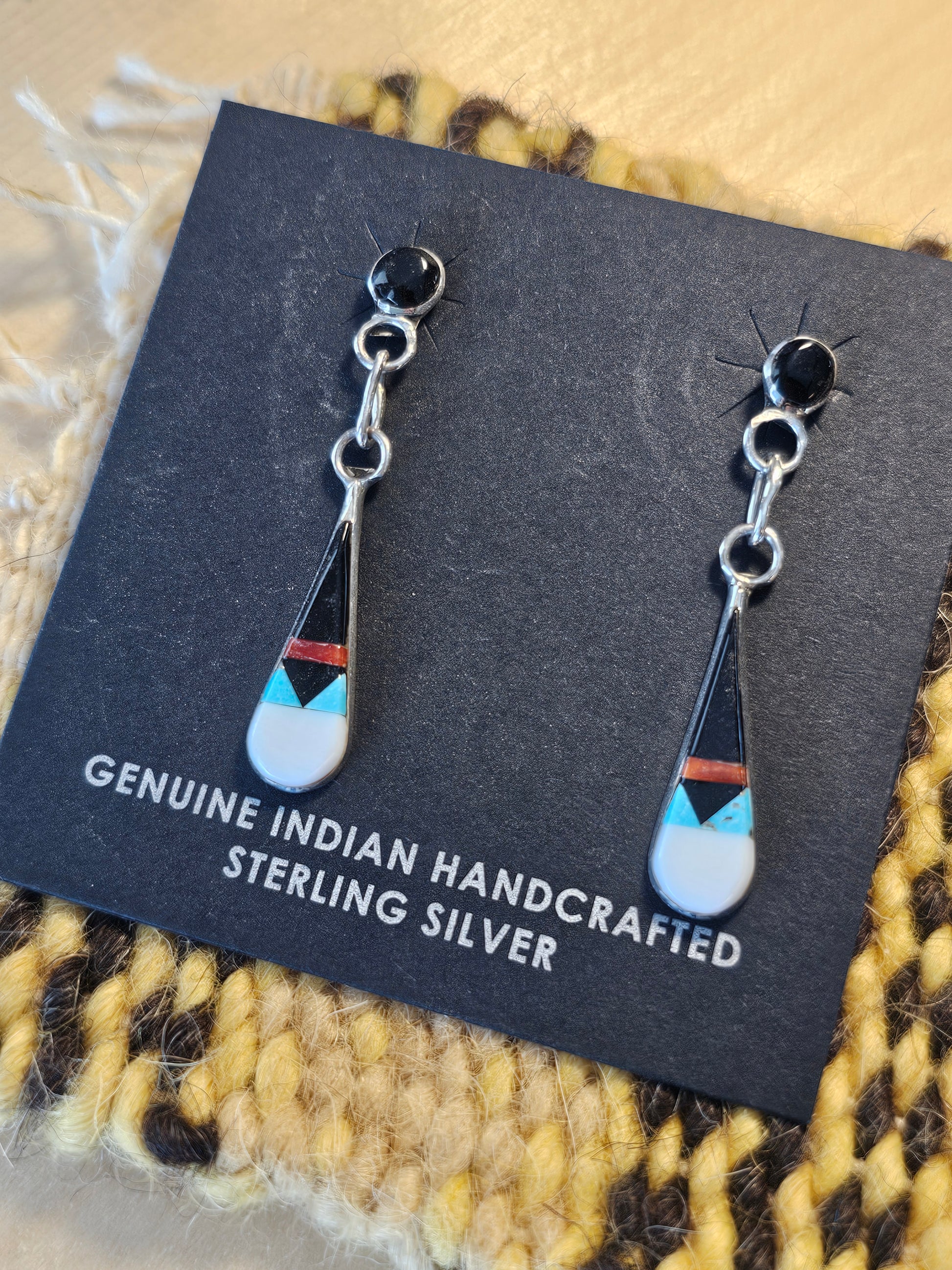 Multi stone inlay earrings, turquoise, jet, coral, mother of pearl. Hand made from artists of the Zuni Nation.