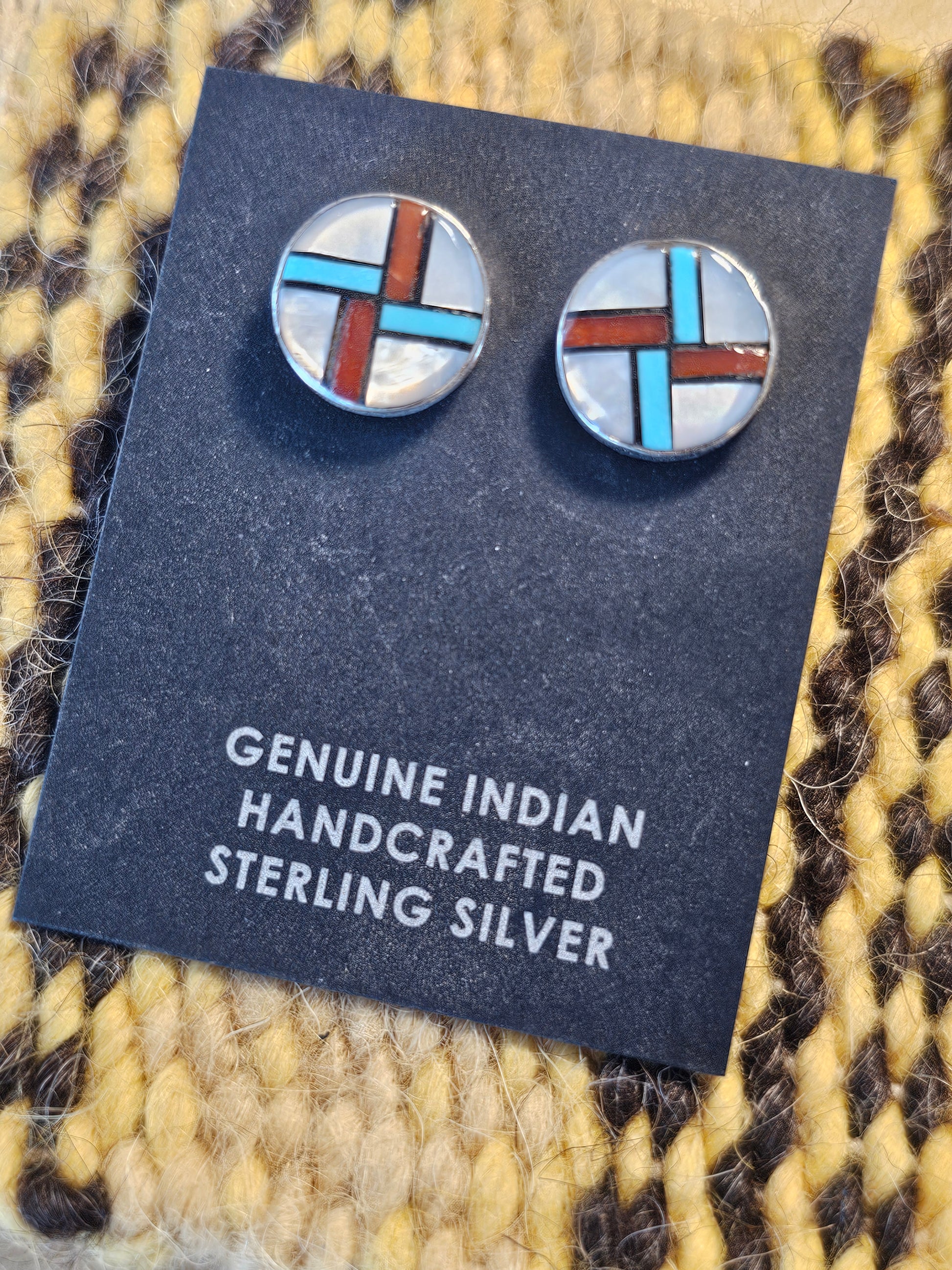 Turquoise, Coral, and Mother of Pearl inlay stud earrings. Hand made from artists of the Zuni Nation.