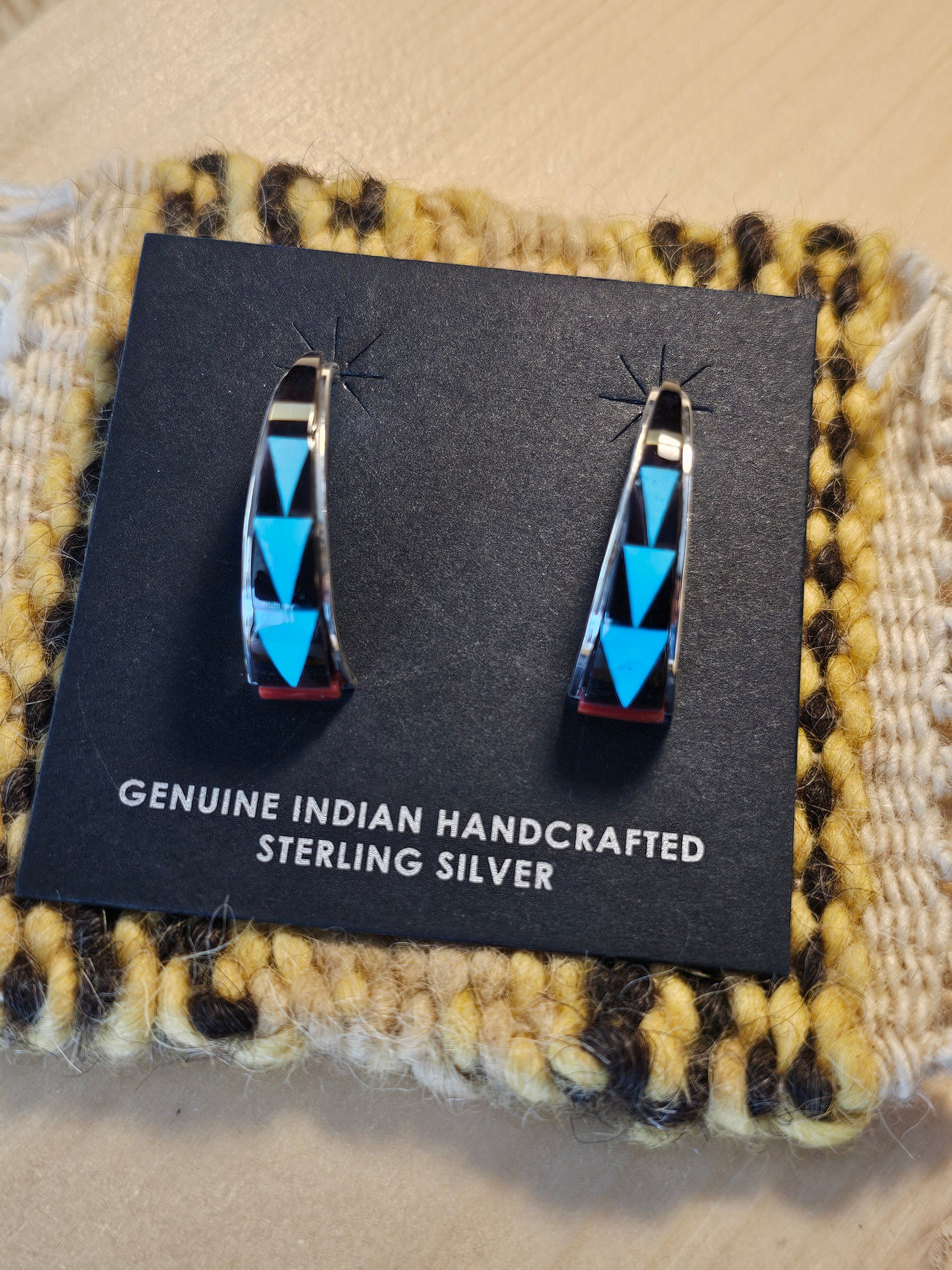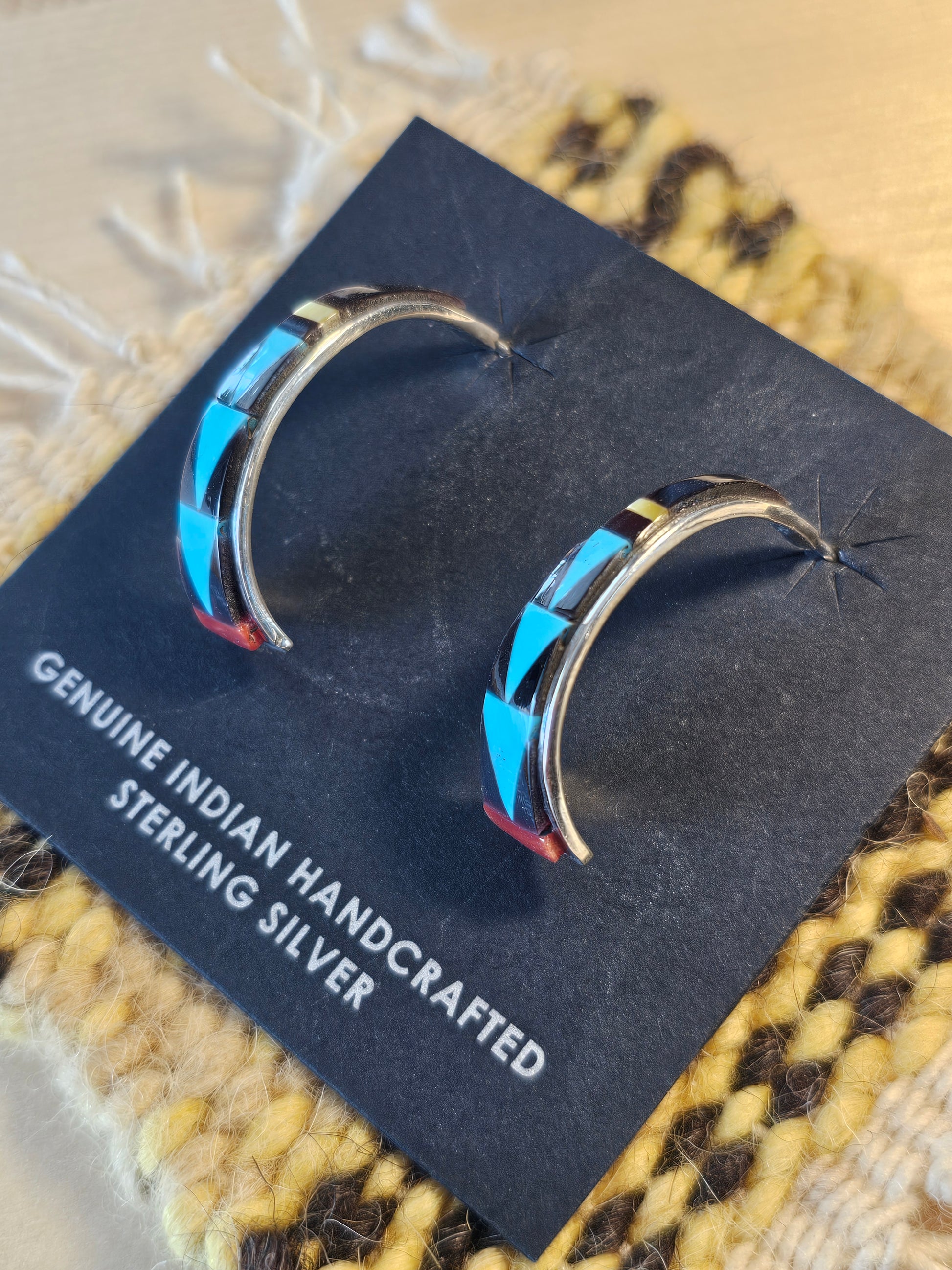Multi stone inlay half loop earrings. Turquoise, coral, jet, and mother of pearl. Hand made from artists of the Zuni Nation.