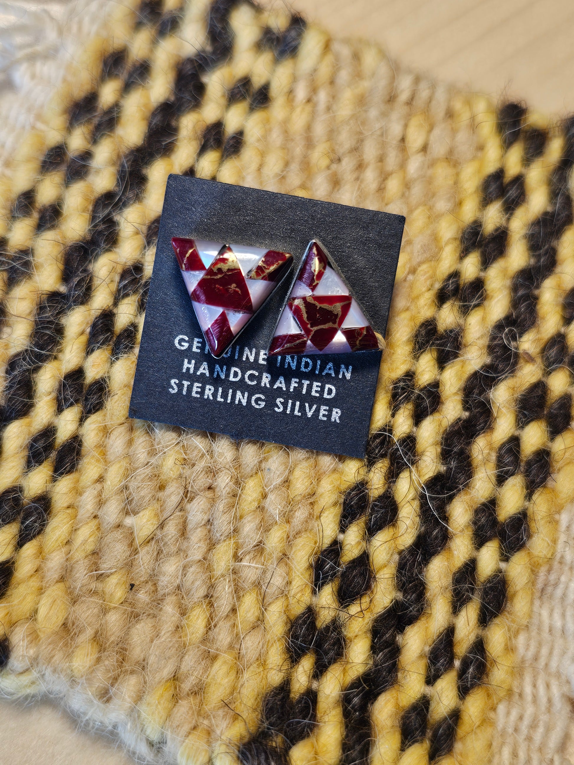 Mother of Pearl and Jasper triangle stud earrings. Hand made from artists of the Zuni Nation.